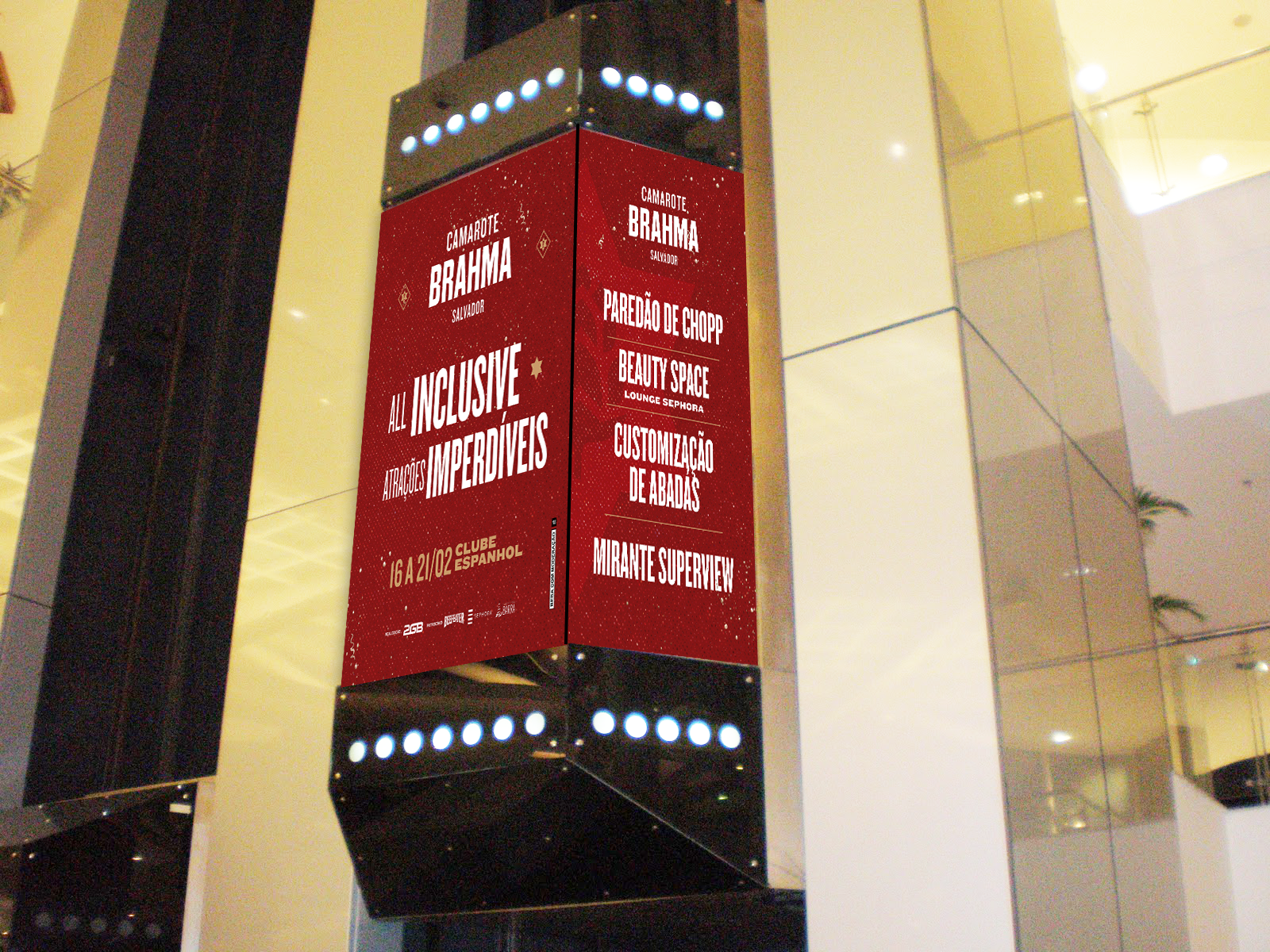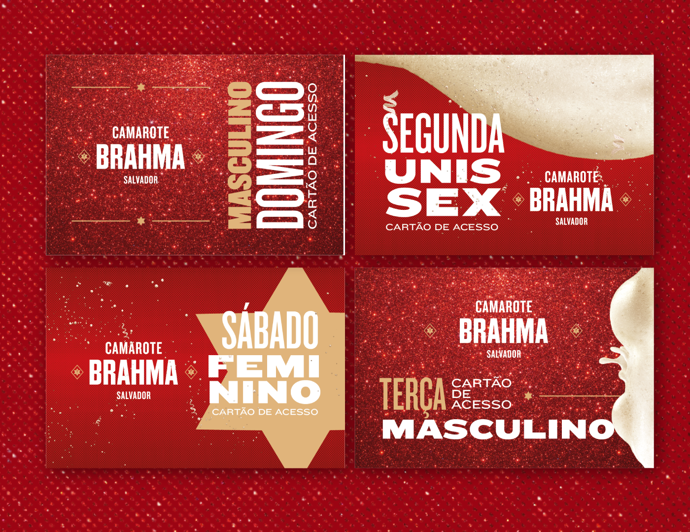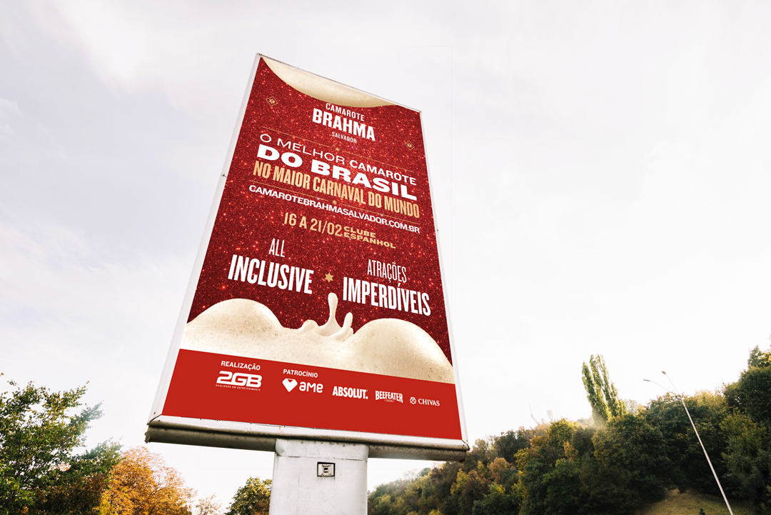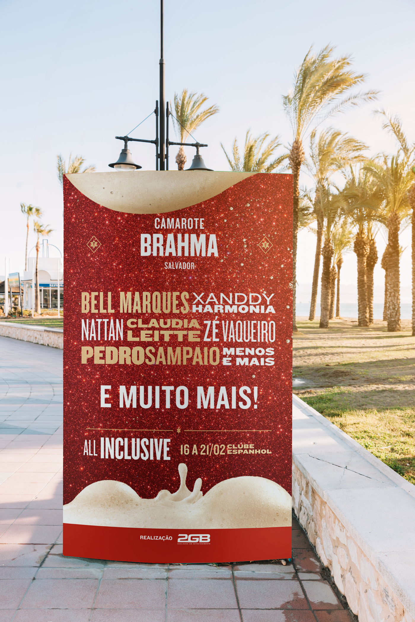 O Camarote Brahma desembarcou em Salvador pela primeira vez em 2023. A proposta da identidade visual focou em transmitir o glamour, cremosidade e premiunidade que só Brahma tem. Utilizando de elementos proprietários da marca e elementos autorais exclusivos, foram produzidas as peças on e off do Camarote, incluindo sinalizações, KV para instagram, peças Out of Home, telas para os LEDs da fachada, convites, cartões de acesso e muito mais!