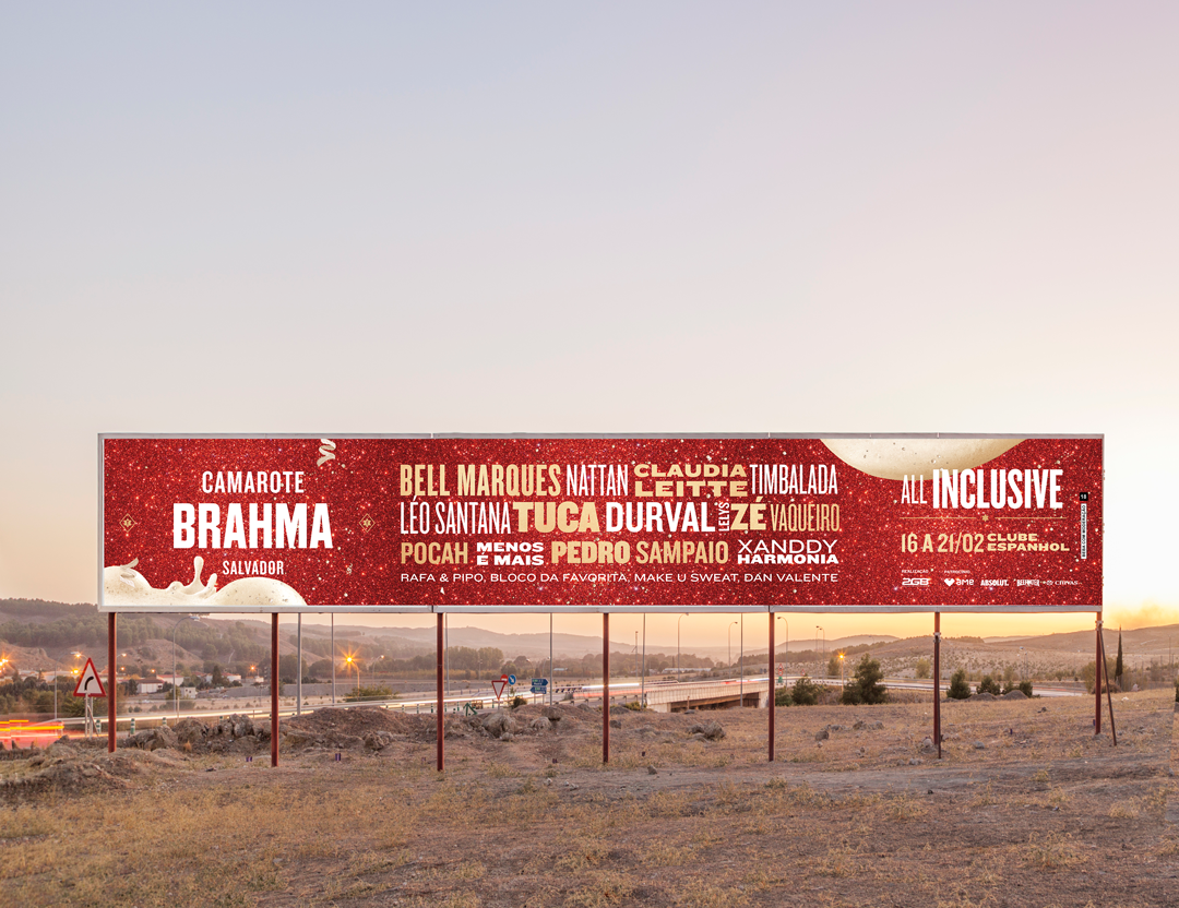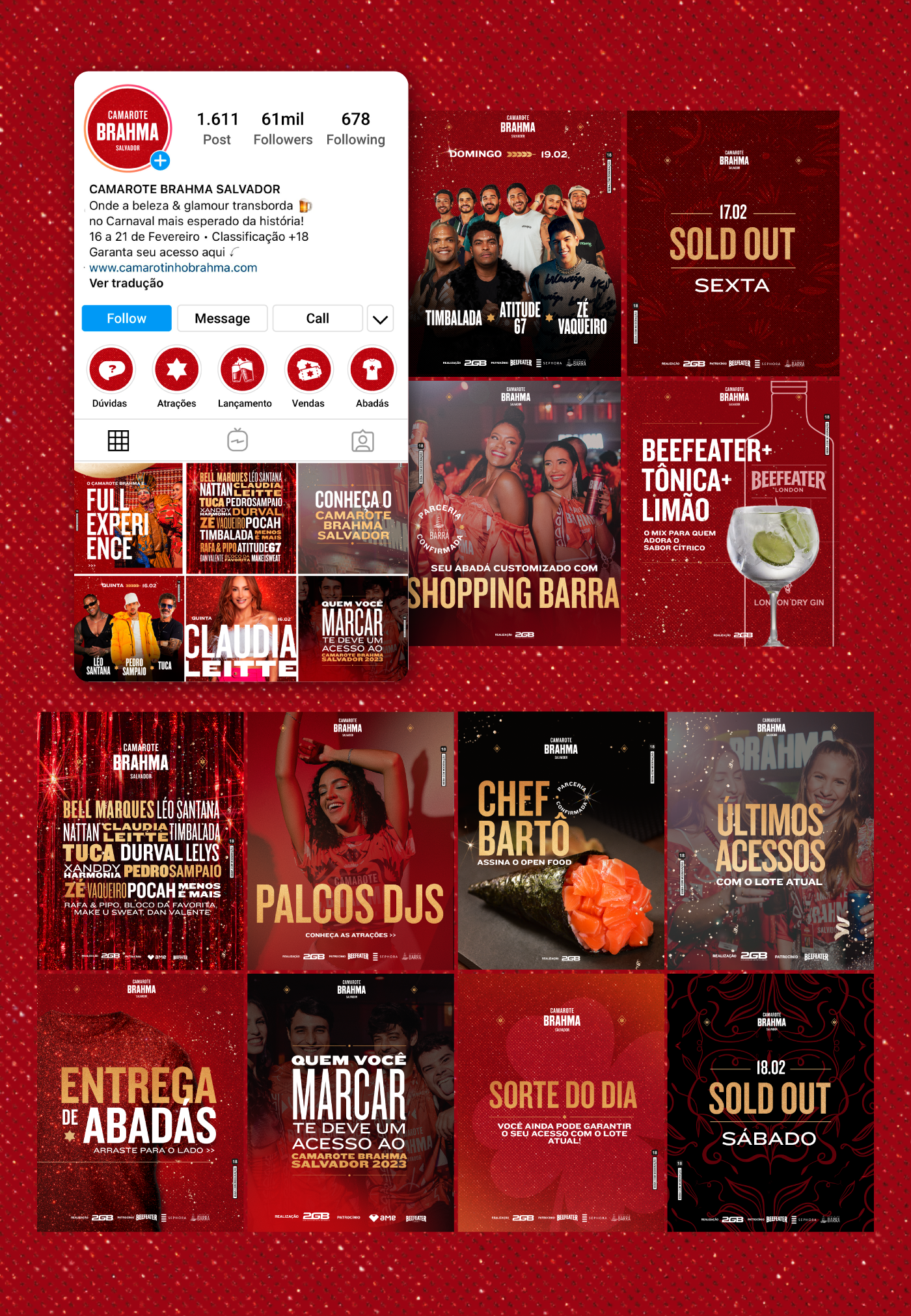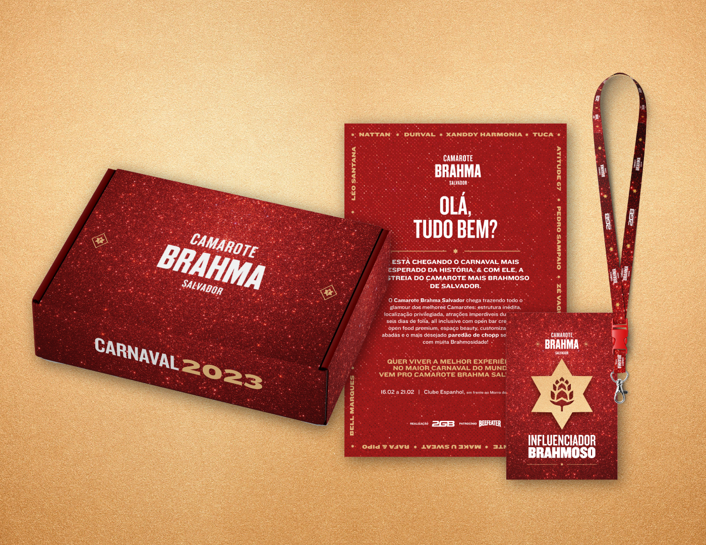 O Camarote Brahma desembarcou em Salvador pela primeira vez em 2023. A proposta da identidade visual focou em transmitir o glamour, cremosidade e premiunidade que só Brahma tem. Utilizando de elementos proprietários da marca e elementos autorais exclusivos, foram produzidas as peças on e off do Camarote, incluindo sinalizações, KV para instagram, peças Out of Home, telas para os LEDs da fachada, convites, cartões de acesso e muito mais!